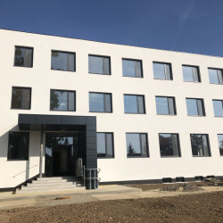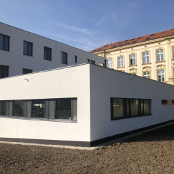 Antracitový obklad byl použit i na fasádě mezi vstupními dveřmi. Součástí stavby bylo i vybudování nové podzemní spojovací cesty mezi hlavní budovou gymnázia a rekonstruovaným objektem.