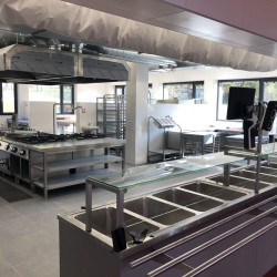 Stavební zakázka řešila vybudování přístavby a nové využití stávajícího čtyřpodlažního objektu pro kuchyni a zázemí školní jídelny, do rekonstruovaného objektu byla přesunuta školní jídelna, v horních patrech jsou specializované PC učebny a pokoje pro příležitostné ubytování studentů. Řešené objekty se nachází v parkovém areálu gymnázia a obchodní akademie v sousedství původních historických budov.