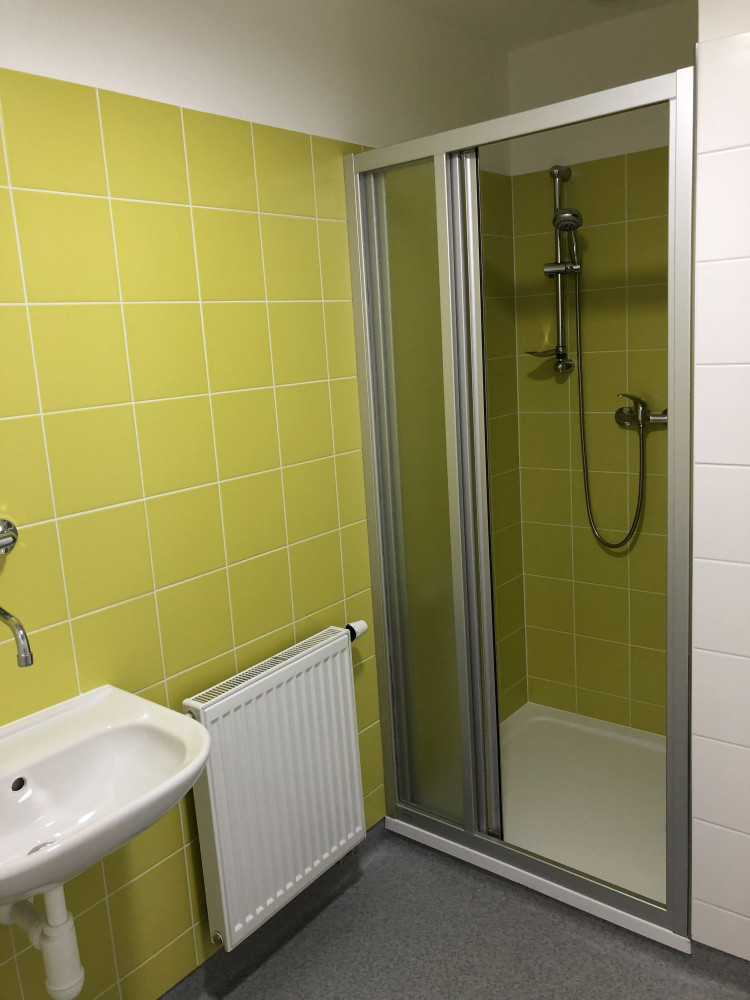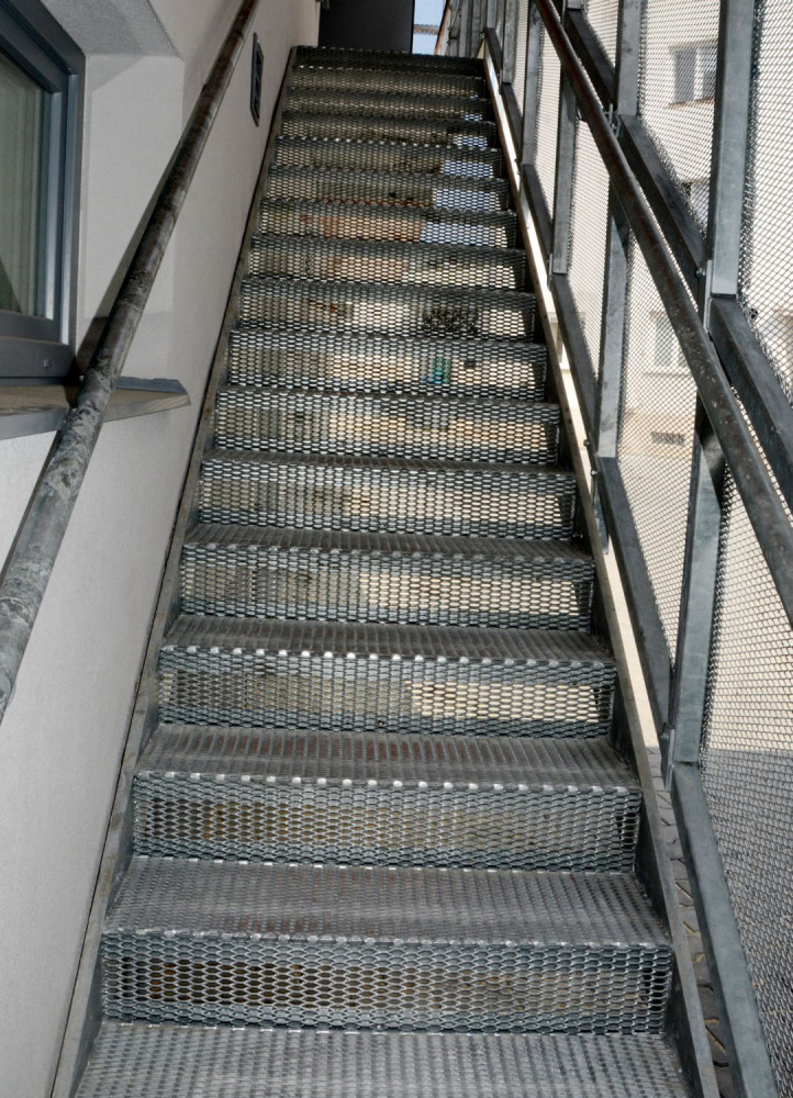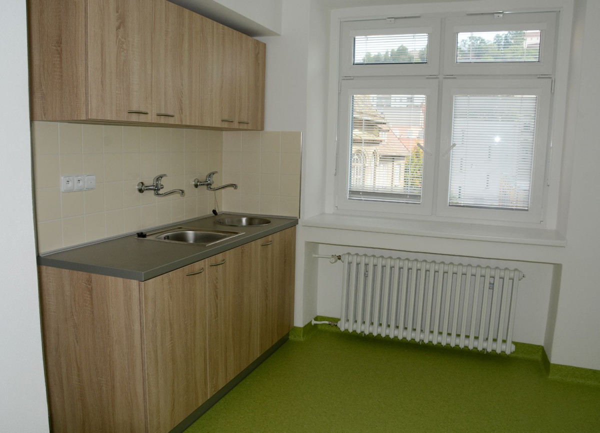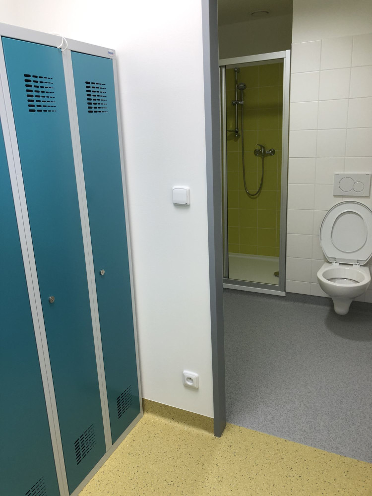 Druhé nadzemní podlaží je přístupno po vnějším krytém schodišti. Ze společné chodby je dostupná dvojice kanceláří, šatny a sociální zázemí muži, ženy a pobytová místnost personálu.