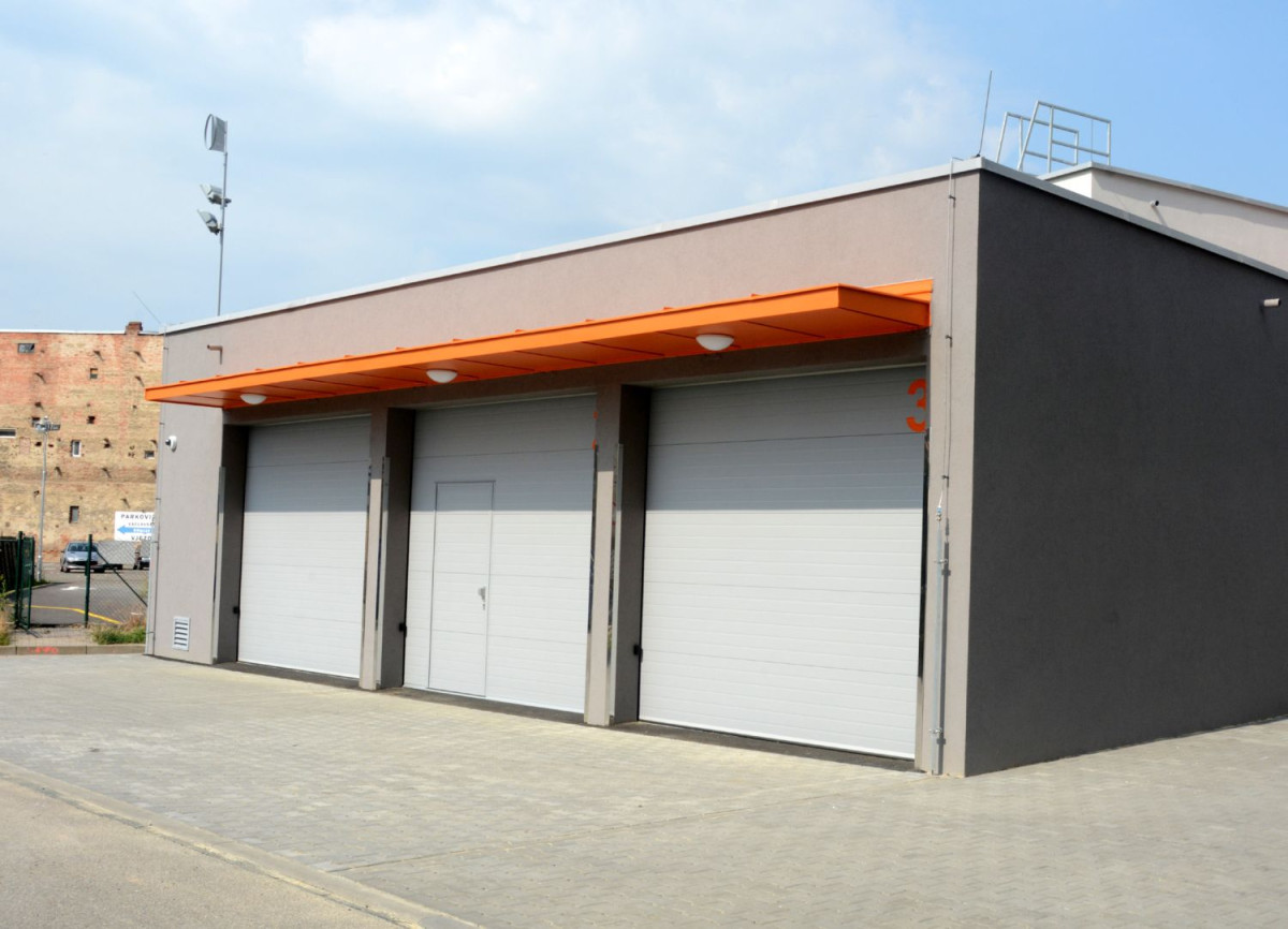 Jednopodlažní část určená pro dopravu je přístupná přímo z terénu pomocí trojice automatických sekčních vrat s otevíravou částí pro přístup bez nutnosti výsunu. Garáž je řešena jako jeden společný prostor sloužící pro parkování traktoru, vysokozdvižného vozíku a osobního automobilu. Na tuto část navazuje místnost skladu se samostatným přístupem. V rámci prvního nadzemního podlaží skladové části jsou za sebou seřazeny následující místnosti: chladící box s předsíní (krátká vzdálenost k chladícím jednotkám na boční stěně budovy), dále sklad pro parkování káry, sklad nebezpečných odpadů, sklad a kancelář personálu odpadového hospodářství se sociálním zázemím.