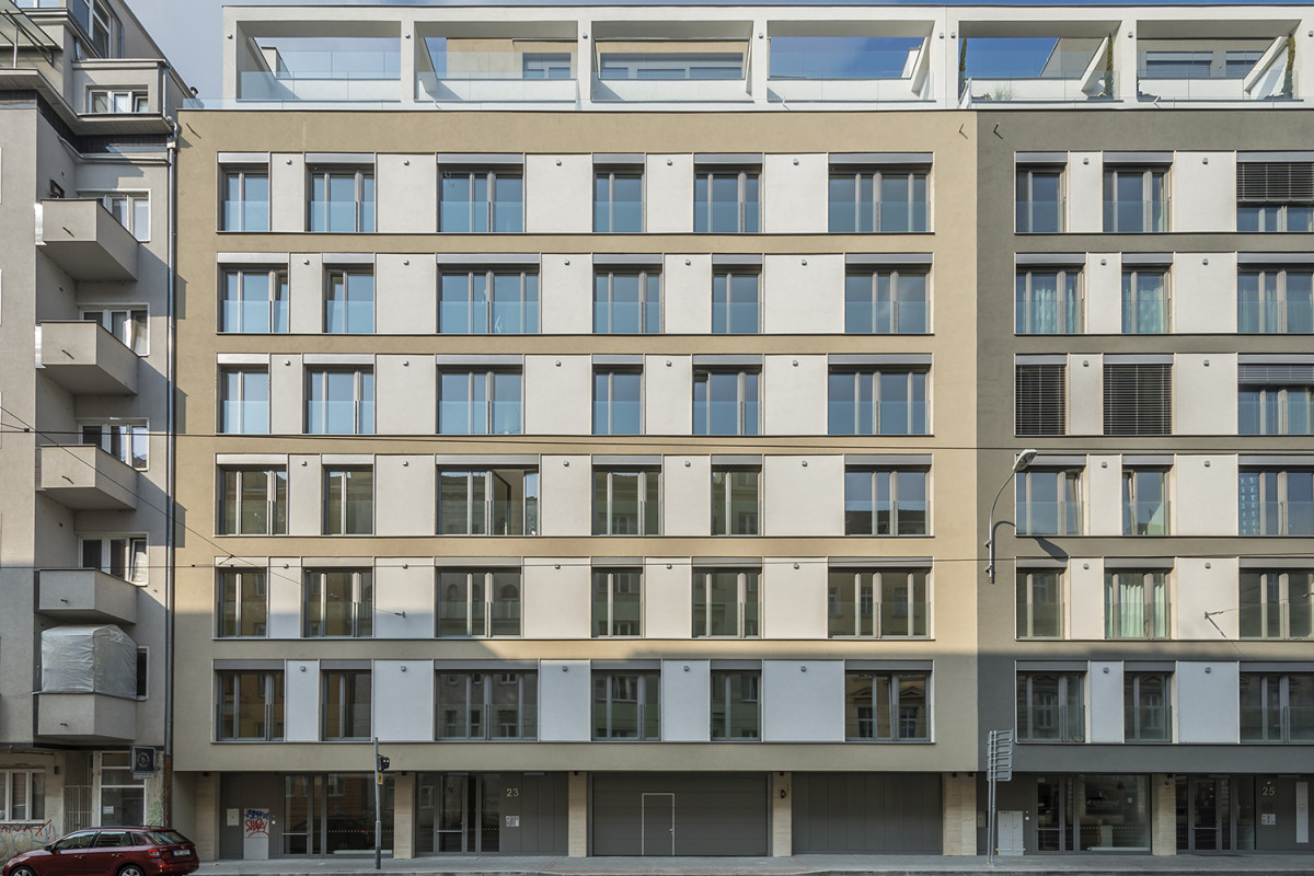 Objekt je založen na velkoprůměrových ŽB pilotách, sousední objekt a komunikace jsou podchyceny pilotovou stěnou. Nosná konstrukce objektu je z ŽB monolitu, částečně pohledového, od 7NP dále je v kombinaci ŽB monolitických stropů a vyzdívaných stěn z keramických tvárnic. V 1PP je použita konstrukce zdvojené podlahy ze systémových plastových tvarovek. Vnitřní nosné stěny a dělicí příčky jsou vyzdívány z keramických tvarovek s ohledem na zvýšené akustické požadavky mezibytových stěn. Dům je zastřešen plochou střechou s hydroizolací PVC pásy, střecha nad garážemi je provedena jako zelná extenzivní střecha. Dům je zateplen certifikovaným zateplovacím systémem ETICS v kvalitativní třídě ,,A", v 1NP je fasáda doplněna kamenným obkladem. Součástí zakázky jsou také veškeré klempířské a zámečnické prvky, obklady a dlažby, výmalby a nátěry, vnitřní dveře, podhledy, podlahy. Provedeny jsou kompletní rozvody zdravotechniky. ústředního topení, elektroinstalací - silnoproudých a slaboproudých, měření a regulace a vzduchotechniky. V objektu se také nachází výtah a zvedací parkovací plošiny.