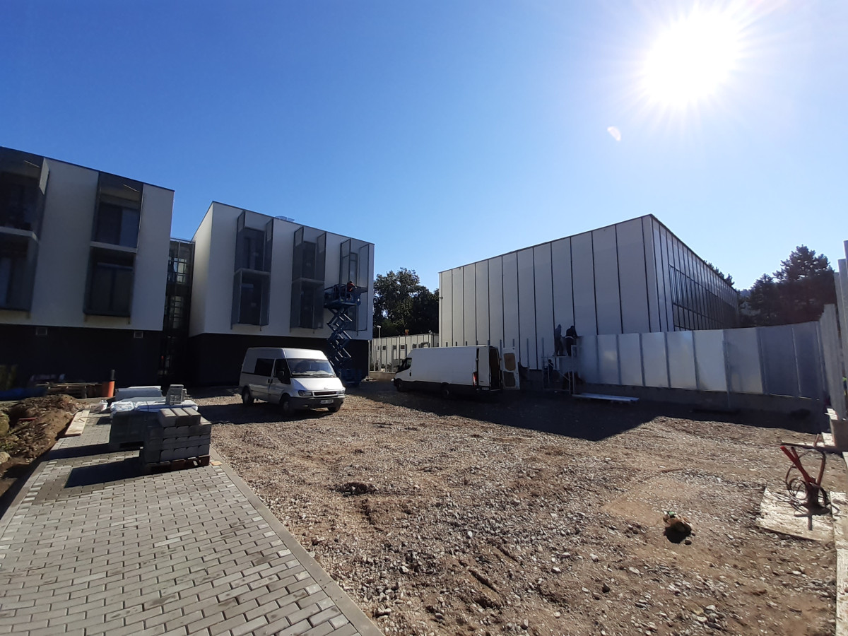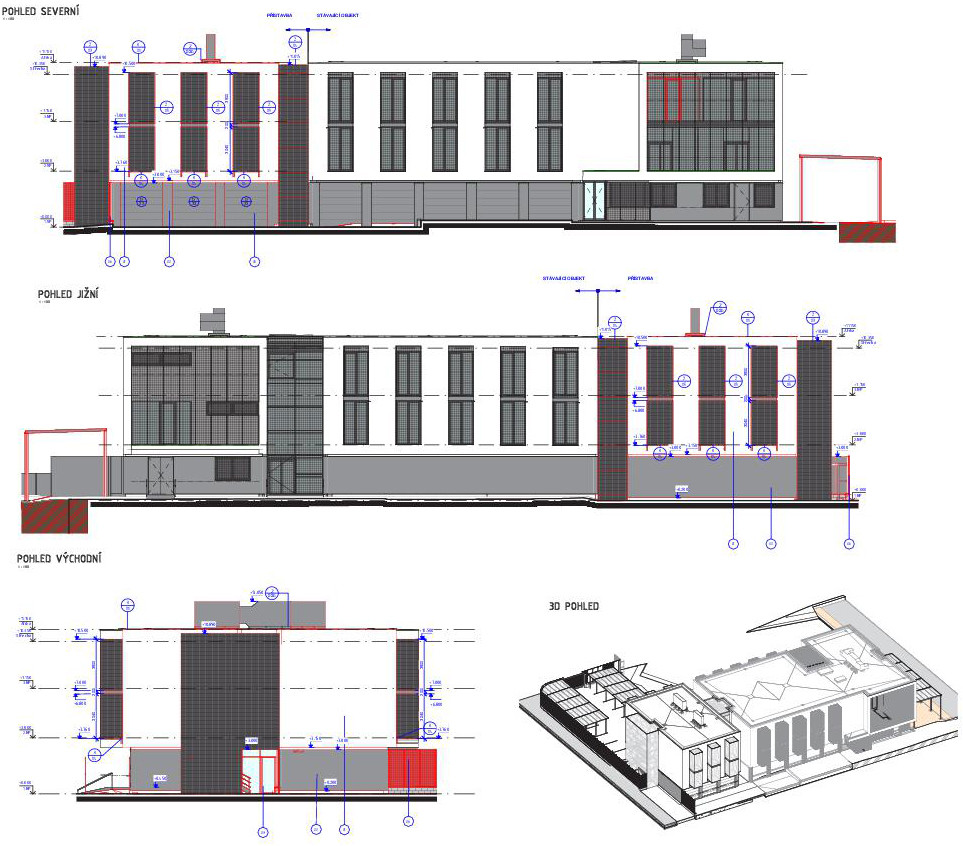 spřaženou s pilotami. Sloupy jsou zapuštěny do kalichu. Propojení se stávajícím objektem je zajištěno pomocí proskleného spojovacího krčku. Přístavba je 3. podlažní a svým provedením kopíruje stávající řešení. Střešní konstrukce je typu zelená extenzivní střecha s výsadbou společenstva rozchodníků a netřesků. Obvodové stěny jsou zatepleny kontaktní zateplovacím systémem ETICS z minerální vaty. Podlahové konstrukce jsou navrženy jako těžké plovoucí, s roznášecí vrstvou z betonu nebo cementového či anhydritového potěru.