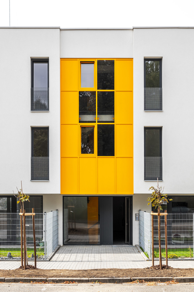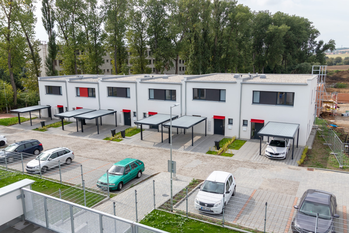 Objekty mají tvar podlouhlého kvádru, který po částech uskakuje od podlaží 1.NP dle svažování terénu o -0,3 m a -0,6 m. Fasáda formou oken reaguje na rozmístění jednotlivých bytů. Objekty se otevírají na západní stranu rozlehlými prosklenými plochami, které navazují na soukromé zahrádky. Okna do ostatních stran jsou řešena jako menší v pravidelném rytmu. Fasáda je navržena v barvě bílé lomené, okna a dveře mají rám v barvě tmavě šedé. Každý z objektů má délku 40,7 m a šířku 10,4 m a nejvyšší výšku 6,5 m. +0,000 je v úrovni 260,50 m.n.m. Dvoupodlažní bytové domy jsou konstrukčně řešeny také jako nosný příčný systém. Obvodové nosné zdivo je navrženo z keramických tvárnic tl. 500mm, vnitřní nosné zdivo a mezi-bytové příčky jsou navrženy tl. 200mm. Jednotlivé příčky jsou také keramické tl. 100, 150, 200mm. Stropy jsou navrženy železobetonové. Střechy jsou jednoplášťové s krytinou z PVC fólie, přitížená kačírkem.